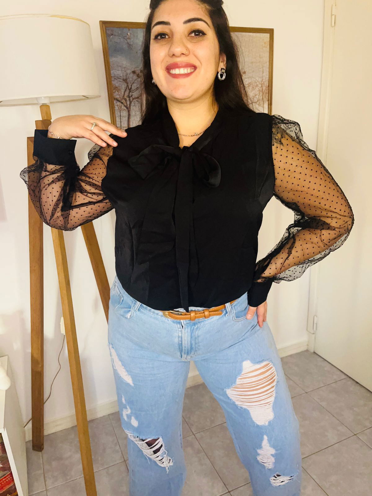 Romántica y femenina ✨ Blusa con cuello de lazo en malla con lunares a contraste. Un detalle sutil que eleva todo tu look.